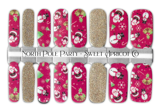 North Pole Party Nail Wraps - Santa and Frosty Design with Gold Glitter Accents